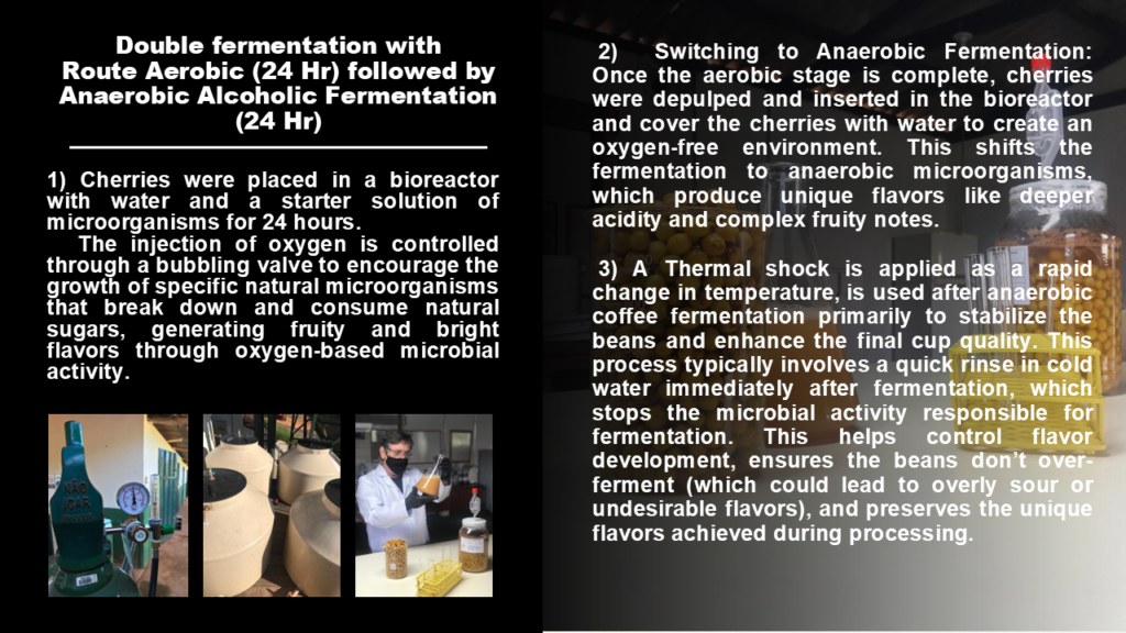 - 一次発酵では、好気性 24時間(Route Aerobic):微生物スターター液と酸素供給により、チェリー内の糖分を分解し、明るくフルーティーな香味を形成。
