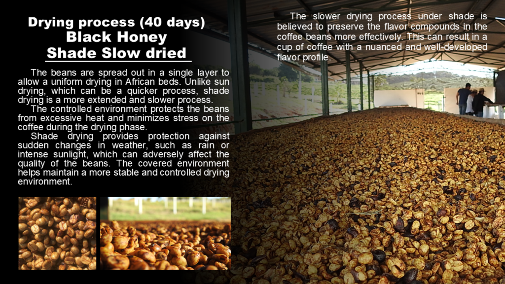 収穫したコーヒーチェリーは、アフリカンベッドに一層に広げ、約40日かけて陰干しでじっくりと乾燥させます。