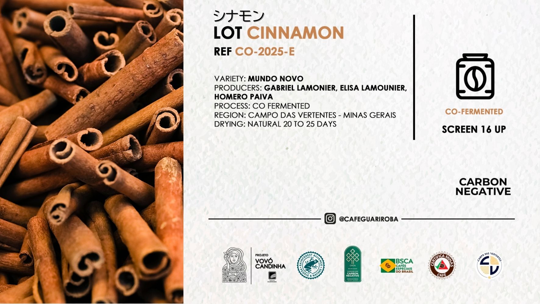 19世紀創業のグアリロバ農園は、5代にわたり受け継がれる名門農園。ミナスジェライス州カンポ・ダス・ベルテンテス地区(GI認定産地)で、伝統と革新を融合させたスペシャルティコーヒー生産を行う。カーボニック・マセレーションやアナエロビックなど先進的発酵技術を導入し、テロワールを生かした高品質なコーヒーを世界へ届けている。