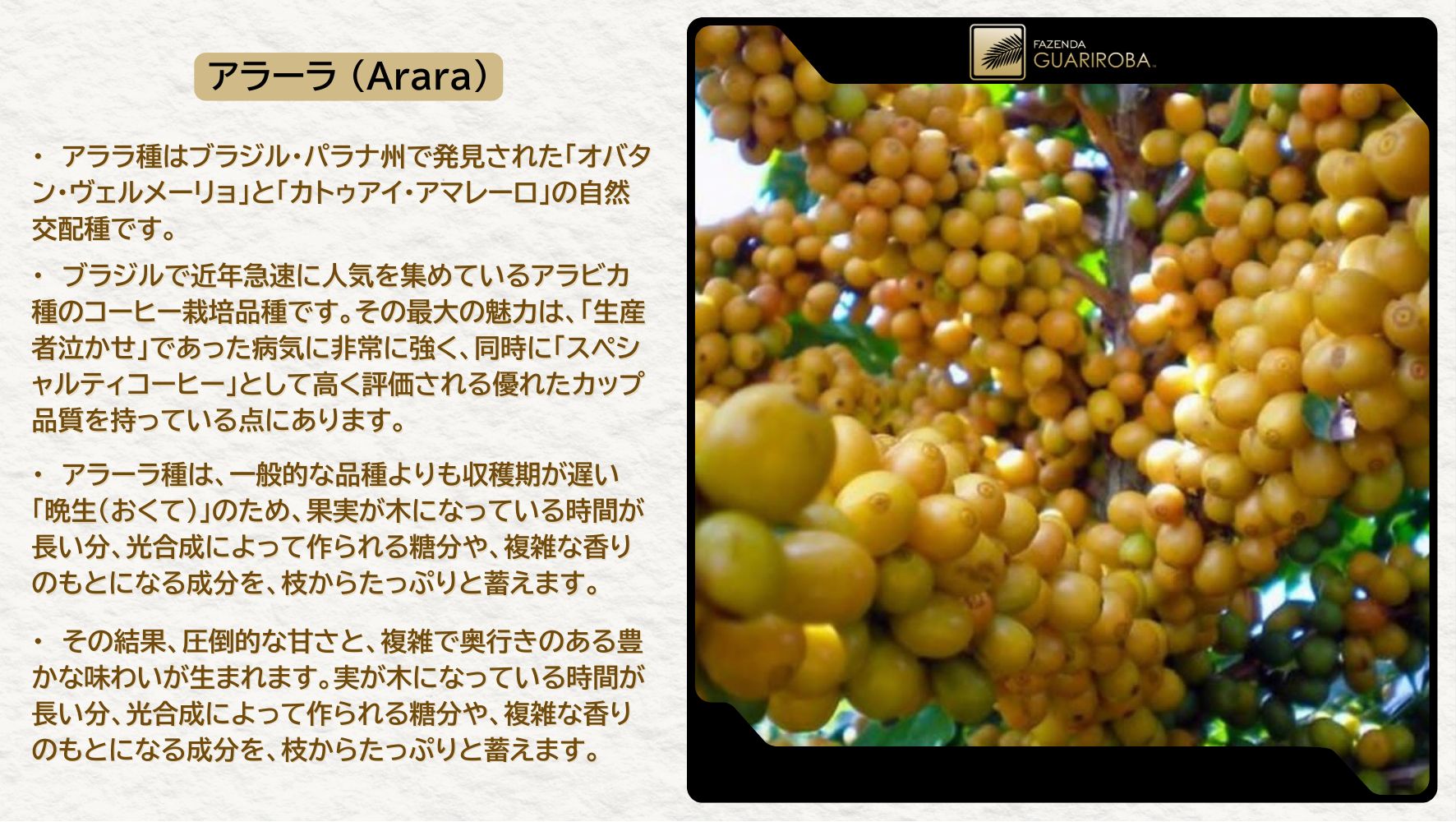 Arara(アラーラ)は、ブラジルで自然交配から選抜・固定化された高品質アラビカ品種です。