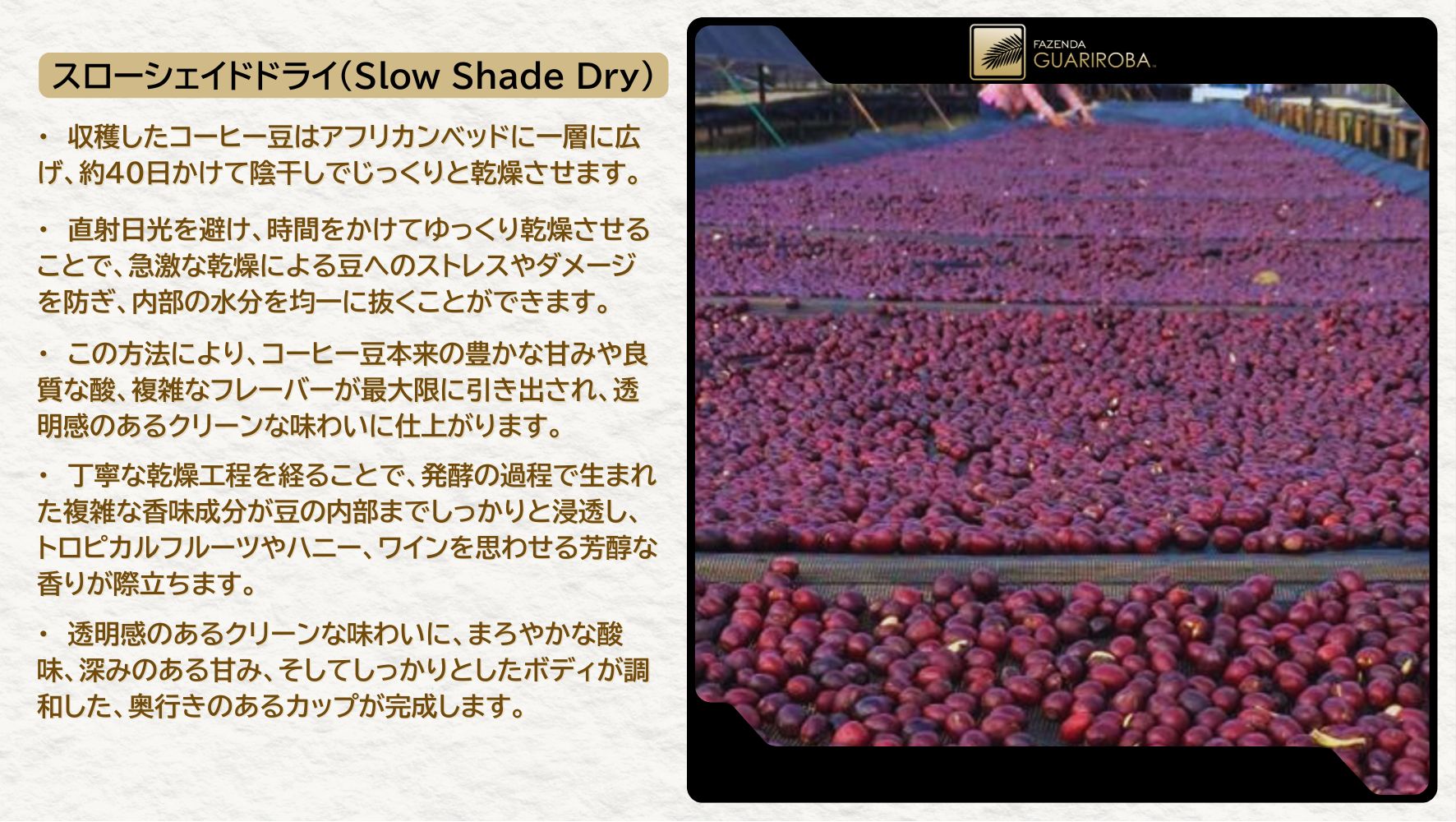 このスロー・シェイド・ドライ方式によって、発酵過程で生まれた複雑な香味成分が豆の内部までしっかりと浸透し、