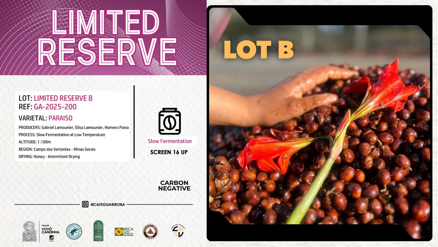 19世紀創業のグアリロバ農園は、5代にわたり受け継がれる名門農園。ミナスジェライス州カンポ・ダス・ベルテンテス地区(GI認定産地)で、伝統と革新を融合させたスペシャルティコーヒー生産を行う。カーボニック・マセレーションやアナエロビックなど先進的発酵技術を導入し、テロワールを生かした高品質なコーヒーを世界へ届けている。