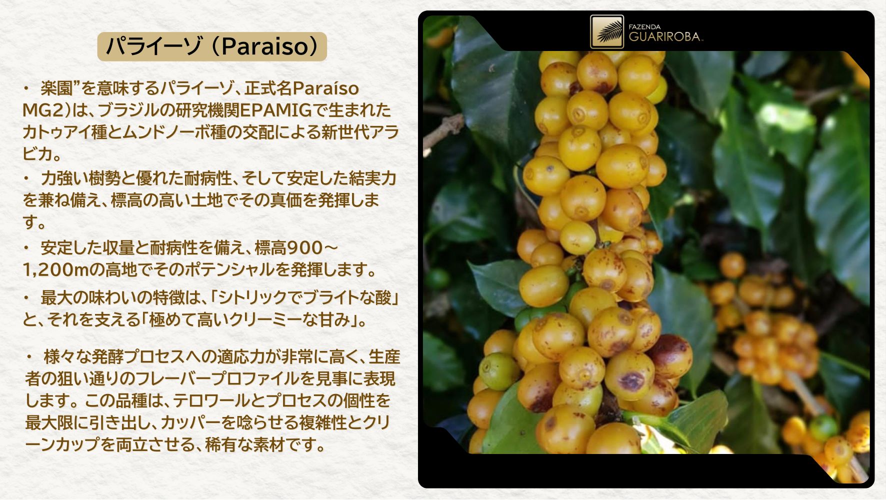 ・ 楽園”を意味するパライーゾ、正式名Paraíso MG2)は、ブラジルの研究機関EPAMIGで生まれたカトゥアイ種とムンドノーボ種の交配による新世代アラビカ。