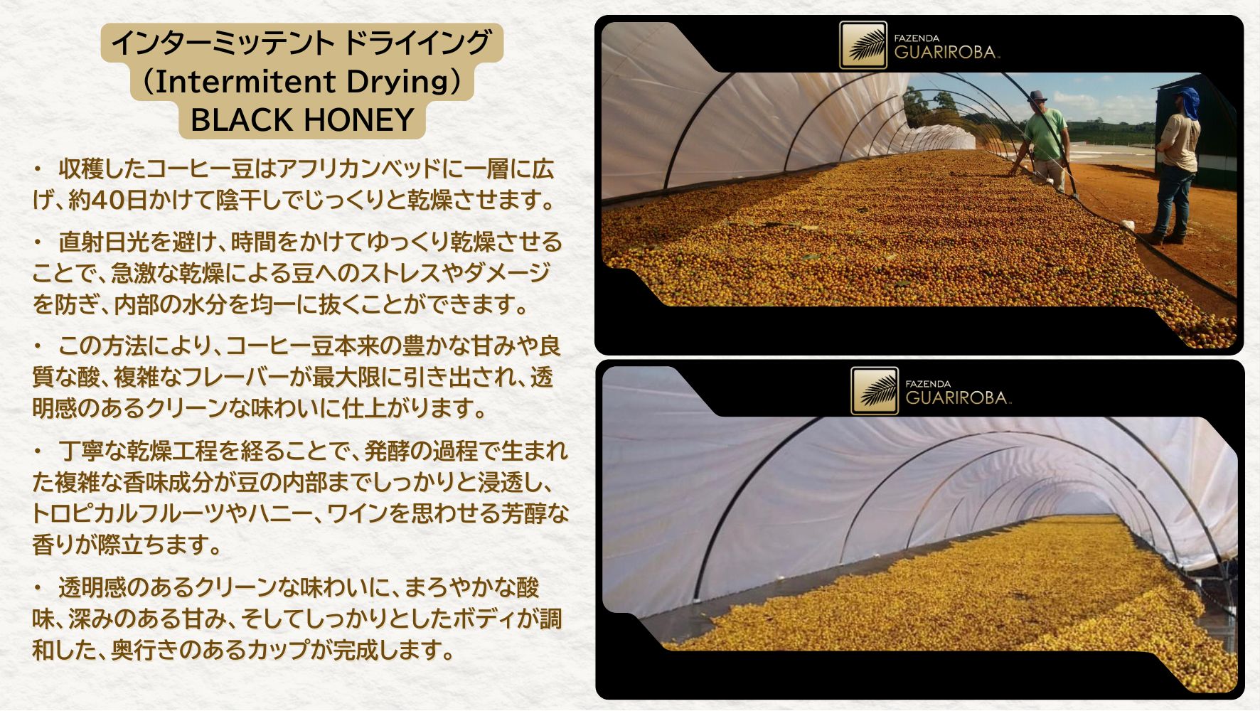 精製方法:Black Honey – Intermitent Drying(ブラックハニー・間欠乾燥)